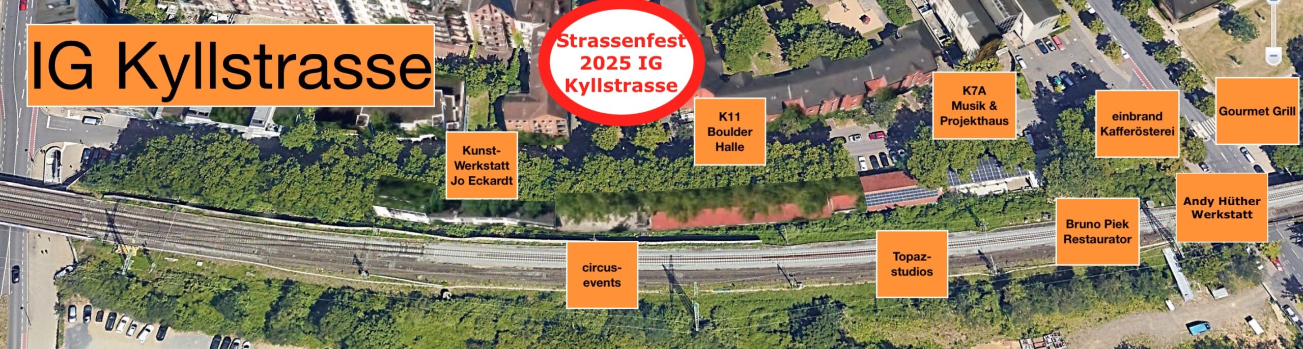 Werkstätten, Zirkuszeltgewerbe, Ateliers, Musikstudios, Konzertraum, Boulderhalle, Kaffee-Rösterei, dazu der „Gourmet Grill“. Die IG Kyllstrasse setzt sich ein für ein kooperatives Miteinander von Kultur & Handwerk hier am Bahndamm, als ein lebendiger Bestandteil der Südstadt.